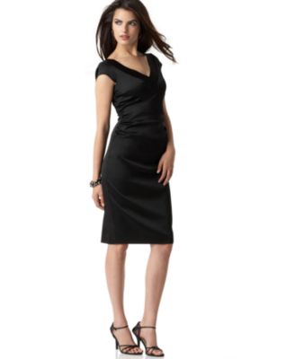 A beautiful stretch-satin cocktail dress in a smooth, curve-hugging design from Tadashi featuring an attached lace bolero jacket with capped sleeves and scalloped trim, a scoop neckline and allover horizontal seams.